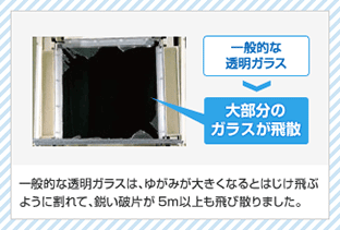 マルチレイヤーNano シリーズは、十分なフィルムの強度と接着力を持ち合わせており、JIS A 5759 で規定するガラスの飛散防止効果を有します。したがって下の写真のように、フィルムが貼ってあると、ガラスは破壊するもののフィルムに保持されて、破片が落下しにくくなります。