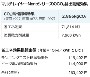 Nano70Sを300m2(東、西、南各100m2ずつ窓ガラスに貼付)した場合のシミュレーションを実施すると、7960kWh の消費電力量が削減され、排出CO2量が2866kg 削減されると推定されます。